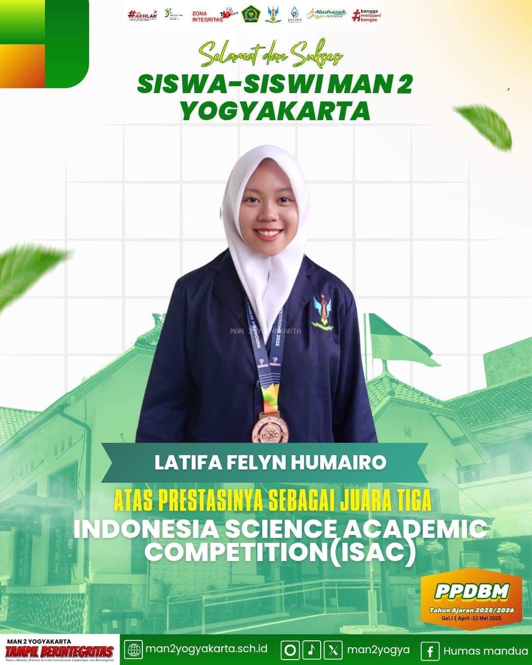 Yogyakarta (MAN 2 Yogyakarta) - Madrasah Aliyah Negeri (MAN) 2 Yogyakarta kembali mencatat prestasi membanggakan melalui salah satu siswi terbaiknya, Latifa Felyn Humairo, kelas X E, yang berhasil meraih Medali Perunggu dalam ajang Indonesia Science Academic Competition (ISAC) 2025 bidang Bahasa Inggris. Kompetisi bergengsi tingkat nasional ini diselenggarakan pada tanggal 13 April 2025 dan diikuti oleh pelajar dari berbagai daerah di Indonesia secara online.