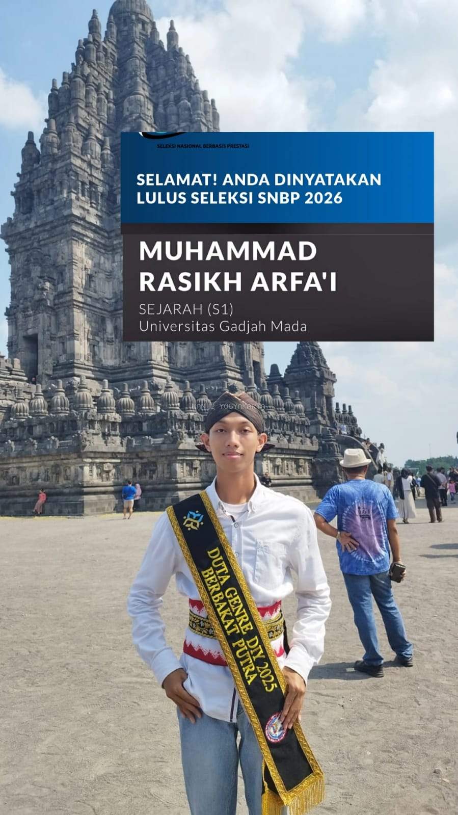 Yogyakarta (MAN 2 Yogyakarta) - Kabar membanggakan datang dari MAN 2 Yogyakarta. Seorang siswa kelas XII F, Muhammad Rasikh Arfa’i, berhasil lolos seleksi masuk perguruan tinggi melalui jalur Seleksi Nasional Berdasarkan Prestasi (SNBP) tahun 2026. Ia diterima di Universitas Gadjah Mada pada Program Studi Sejarah (S1), sesuai dengan minat dan passion yang selama ini ia tekuni.