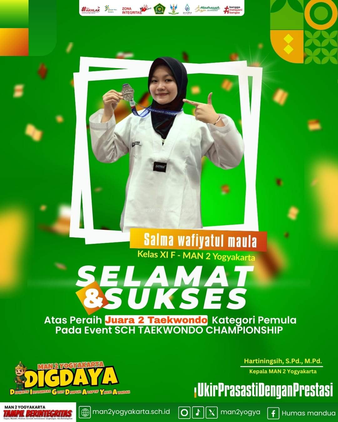 Yogyakarta (MAN 2 Yogyakarta) – Prestasi membanggakan kembali lahir dari siswa MAN 2 Yogyakarta. Kali ini datang dari Salma Wafiyatul Maula, siswi kelas XI F, yang berhasil meraih Juara 2 Taekwondo Kategori Pemula pada ajang bergengsi SCH Taekwondo Championship.