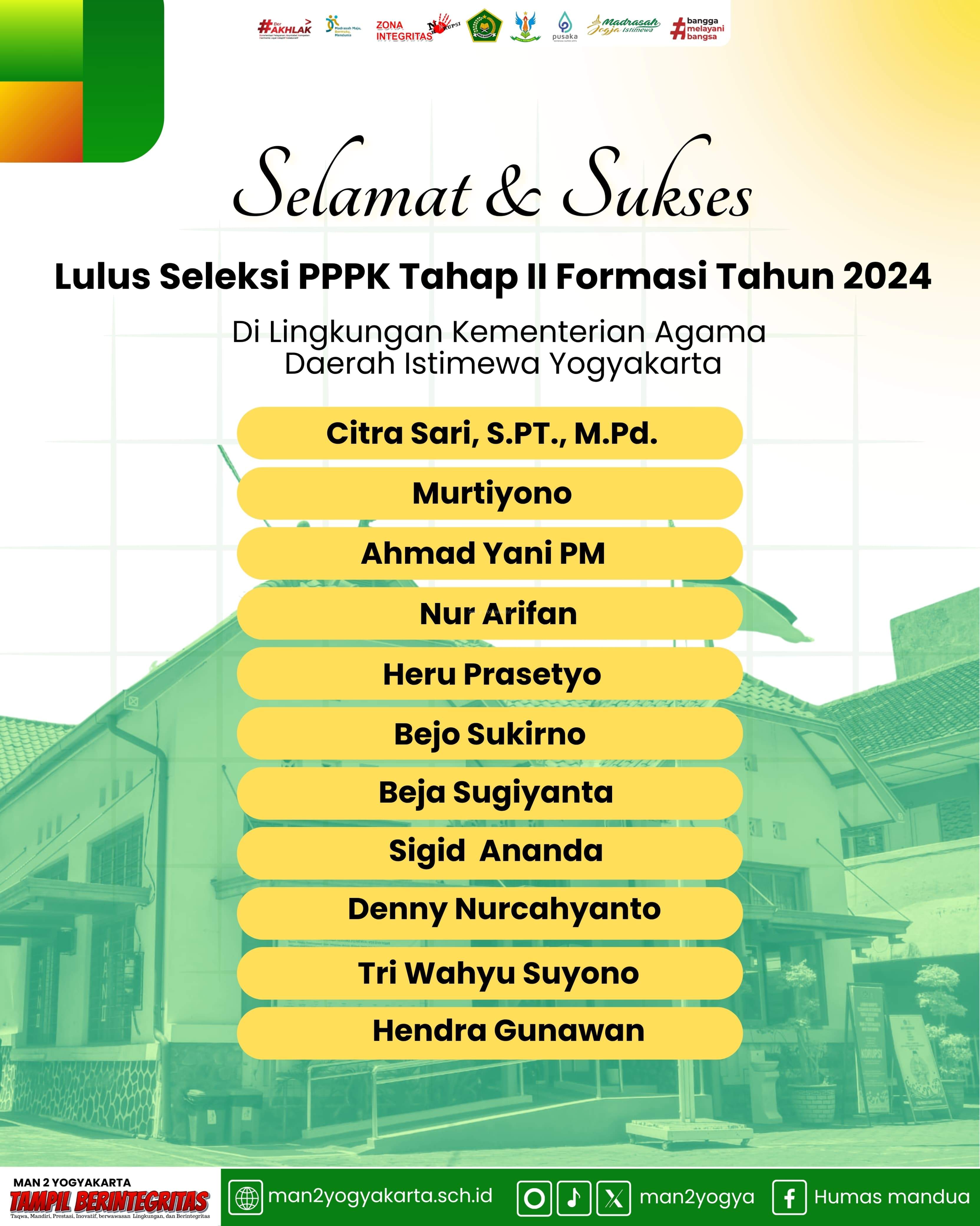 Yogyakarta (MAN 2 Yogyakarta) — Kabar menggembirakan kembali datang dari keluarga besar MAN 2 Yogyakarta. Sebanyak 11 tenaga kependidikan dinyatakan lolos seleksi Pegawai Pemerintah dengan Perjanjian Kerja (P3K) tahun ini. Mereka adalah: Citra Sari, S.Pt., M.Pd., Murtiyono, Ahmad Yani PM, Nur Arifan, Heru Prasetyo, Bejo Sukirno, Beja Sugiyanta, Sigid Ananda, Denny Nurcahyanto, Tri Wahyu Suyono, dan Hendra Gunawan.