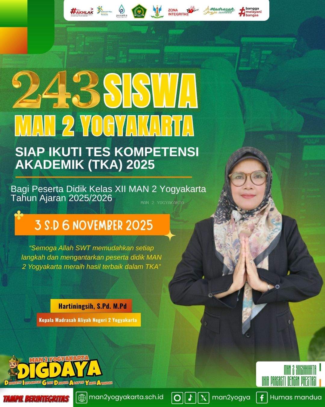 Yogyakarta (MAN 2 Yogyakarta) – Sebanyak 243 murid kelas XII MAN 2 Yogyakarta siap mengikuti Tes Kompetensi Akademik (TKA) 2025, yang akan dilaksanakan pada 3 hingga 6 November 2025. Kegiatan ini menjadi salah satu agenda penting dalam rangkaian evaluasi pembelajaran sekaligus langkah strategis madrasah dalam mempersiapkan peserta didik menuju jenjang pendidikan tinggi tahun pelajaran 2025/2026.