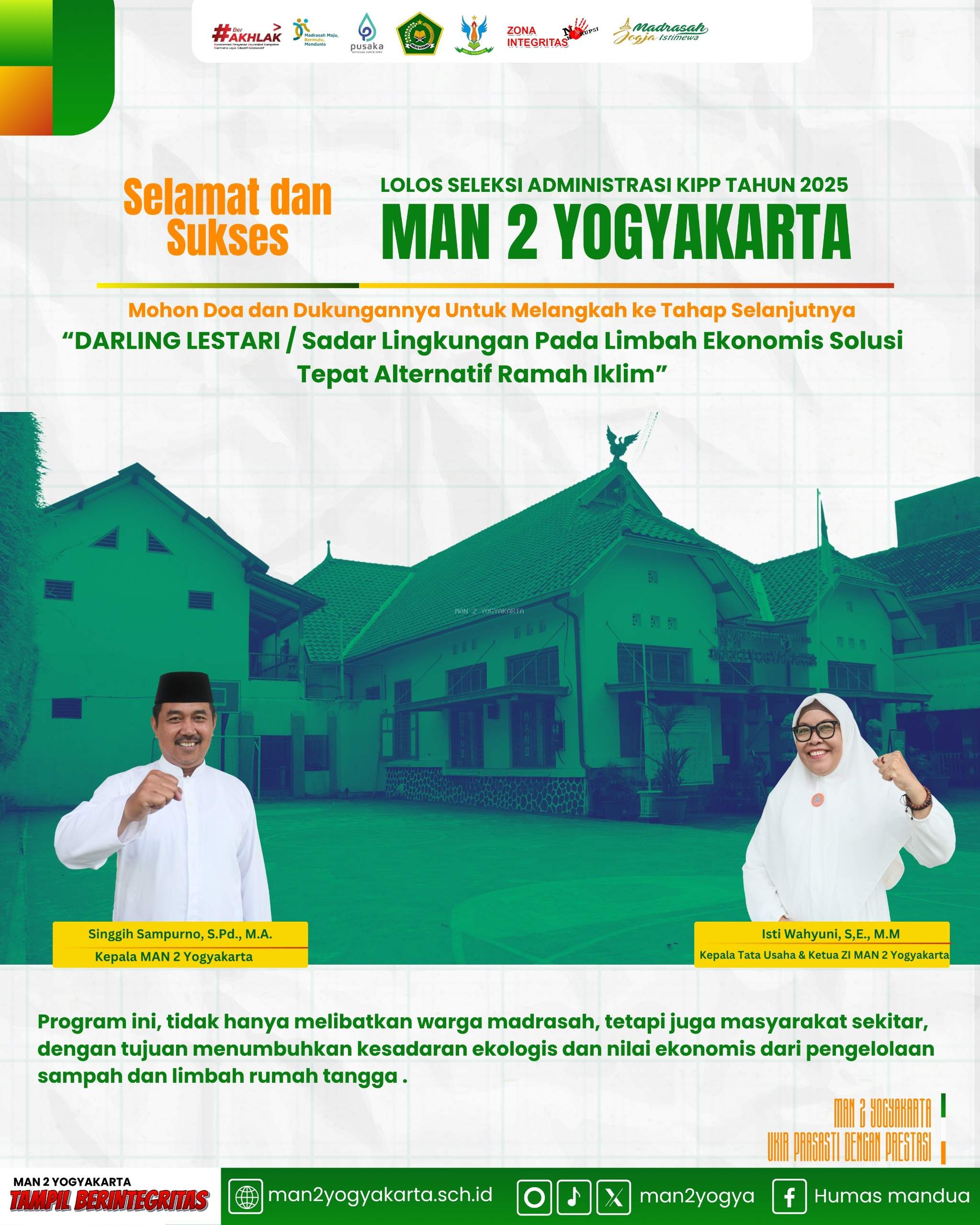 Yogyakarta (MAN 2 Yogyakarta) — Prestasi membanggakan kembali diukir MAN 2 Yogyakarta. Madrasah unggulan ini sukses lolos seleksi administrasi Kompetisi Inovasi Pelayanan Publik (KIPP) 2025, yang diselenggarakan oleh KemenPAN-RB. Inovasi yang diusung tak kalah menarik: “DARLING LESTARI – Sadar Lingkungan pada Limbah Ekonomis, Solusi Tepat Alternatif Ramah Iklim”, bisa diakses melalui : https://youtu.be/SYZjdwmj8l4?si=4XVE_XT1G6Hgiy-2