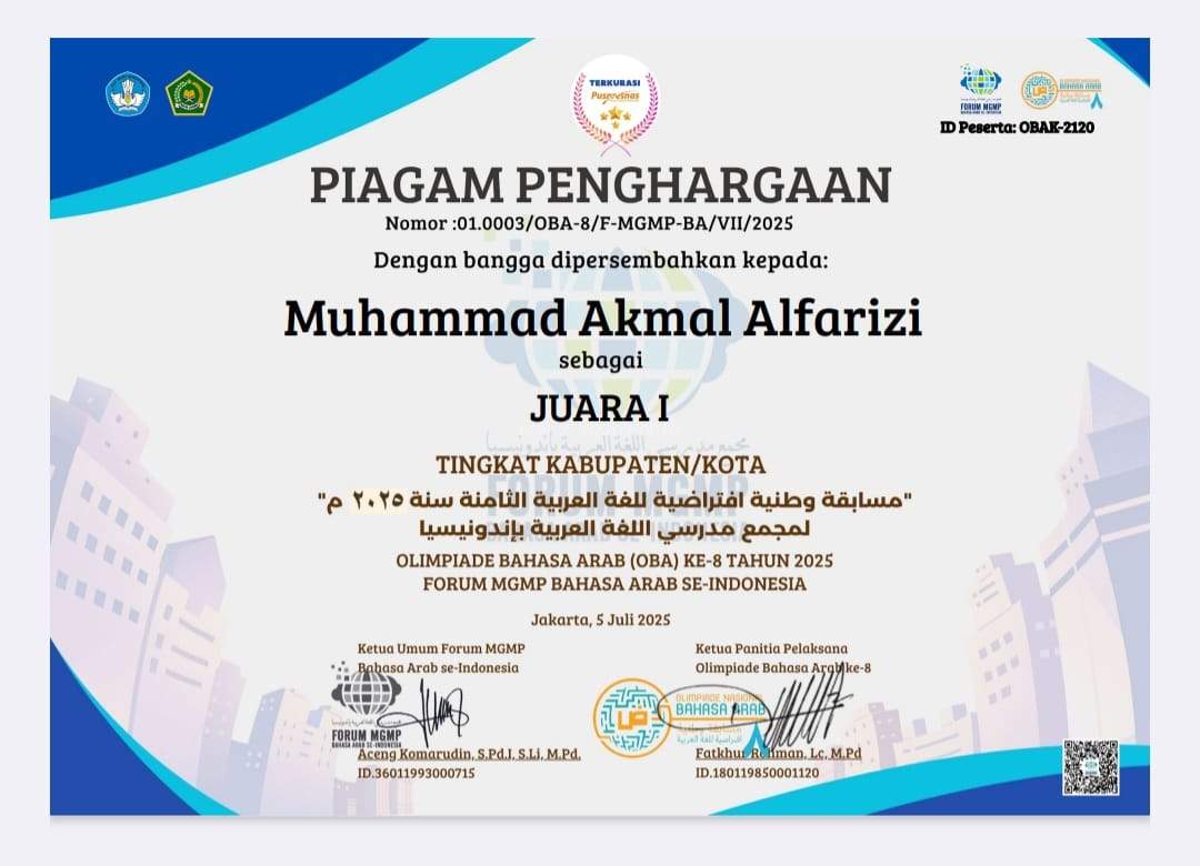 Yogyakarta (MAN 2 Yogyakarta) – Prestasi membanggakan kembali ditorehkan oleh siswa MAN 2 Yogyakarta. Dalam ajang Olimpiade Bahasa Arab (OBA) ke-8 Tahun 2025 yang diselenggarakan oleh Forum MGMP Bahasa Arab se-Indonesia, Muhammad Akmal Alfarizi berhasil meraih Juara I Tingkat Kota Yogyakarta. Dengan gelar juara yang disandangnya, berhak melaju ke tingkat Provinsi DI.Yogyakarta.