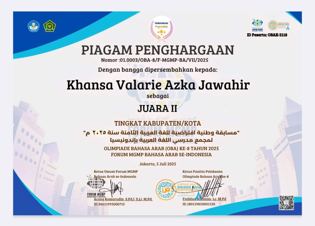 “Kami sangat mengapresiasi pencapaian Khansa. Ini adalah hasil kerja sama siswa, guru, dan seluruh elemen madrasah. Harapan kami, semangat Khansa ini bisa menular ke siswa-siswa lain agar terus berkarya, berprestasi, dan mencintai bahasa Arab sebagai bagian dari identitas dan peradaban.”