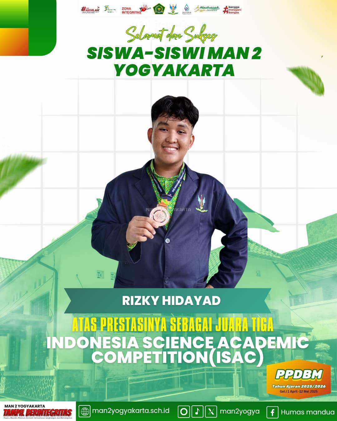 Yogyakarta (MAN 2 Yogyakarta) - Madrasah Aliyah Negeri (MAN) 2 Yogyakarta dengan bangga mengumumkan capaian prestasi siswa-siswinya dalam ajang Indonesia Science Academic Competition (ISAC) 2025 yang diselenggarakan secara nasional pada 13 April 2025. Dalam kompetisi bergengsi bidang Bahasa Inggris, tiga siswa dari kelas X E berhasil meraih Medali Perunggu.