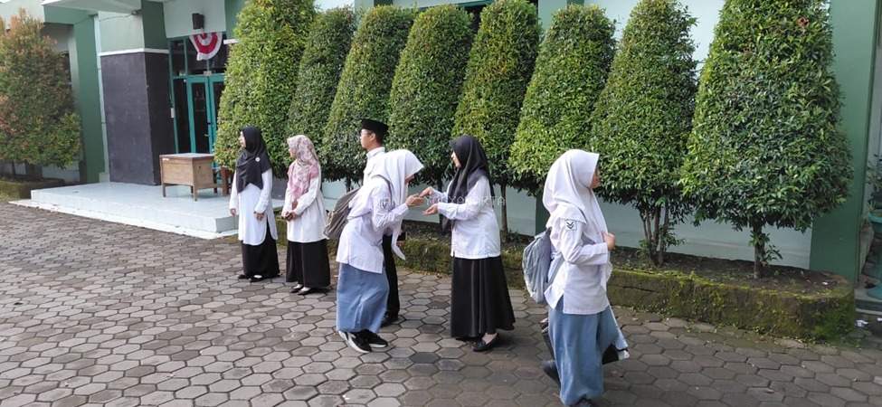siswa berdiri di titik-titik strategis untuk menyapa siswa yang datang dengan