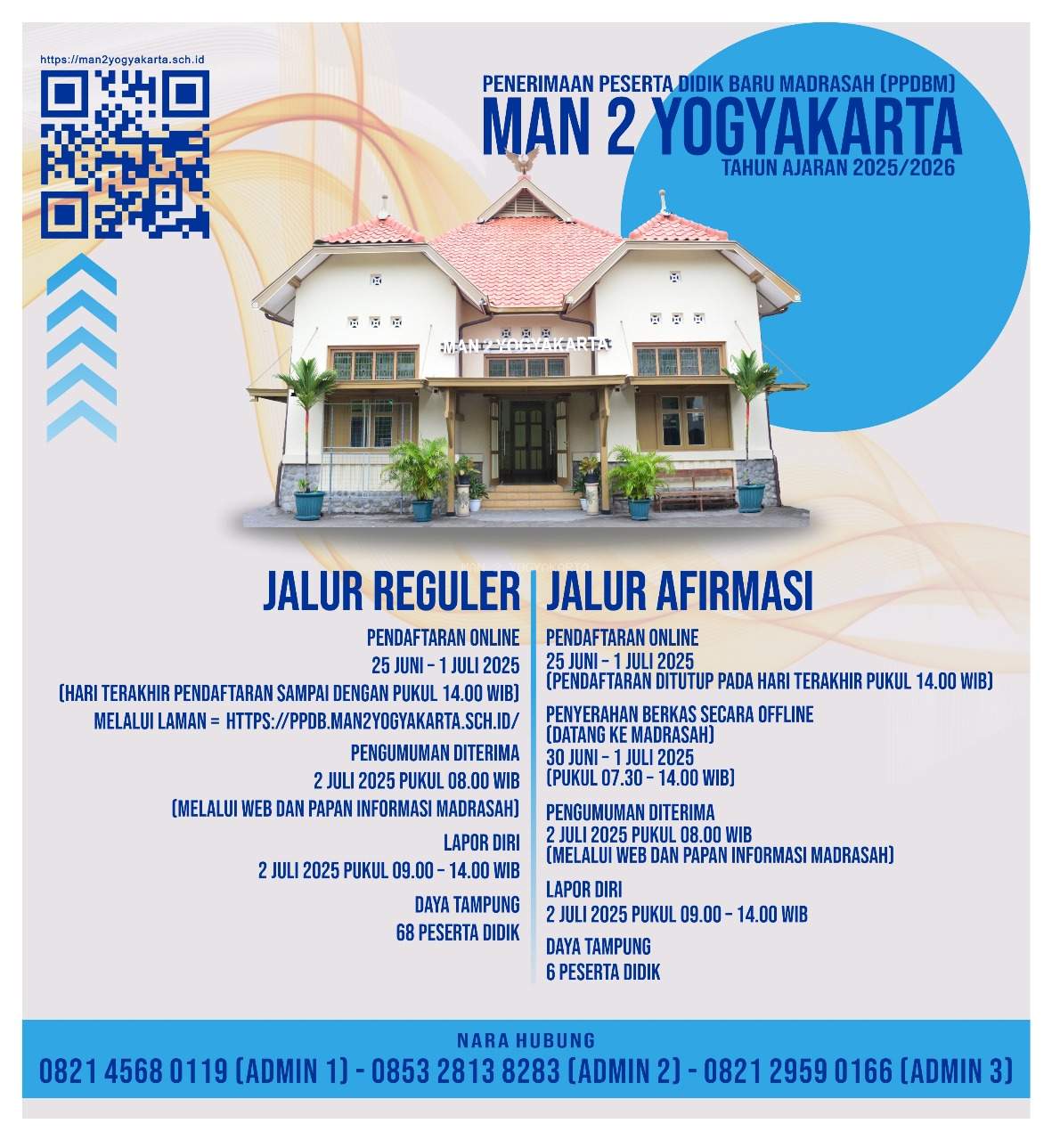 Yogyakarta (MAN 2 Yogyakarta) — Pendaftaran PPDBM Gelombang II Jalur Reguler di MAN 2 Yogyakarta untuk Tahun Ajaran 2025/2026 telah dibuka dan dilakukan secara daring melalui laman https://ppdb.man2yogyakarta.sch.id. Calon peserta didik diwajibkan menyiapkan dokumen sebagai persyaratan, yaitu scan akta kelahiran (usia maksimal 21 tahun), scan ijazah atau Surat Keterangan Lulus (SKL), serta scan nilai ASPD. Selain itu, peserta juga harus mengunggah lembar identitas rapor serta nilai pengetahuan untuk mata pelajaran Matematika, Bahasa Indonesia, Bahasa Inggris, dan IPA dari semester 1 hingga 5. Bila memiliki, sertifikat kejuaraan dalam dua tahun terakhir dapat disertakan untuk mendukung penilaian prestasi. Dokumen terakhir yang wajib diunggah adalah pas foto terbaru ukuran 3x4 berlatar merah.