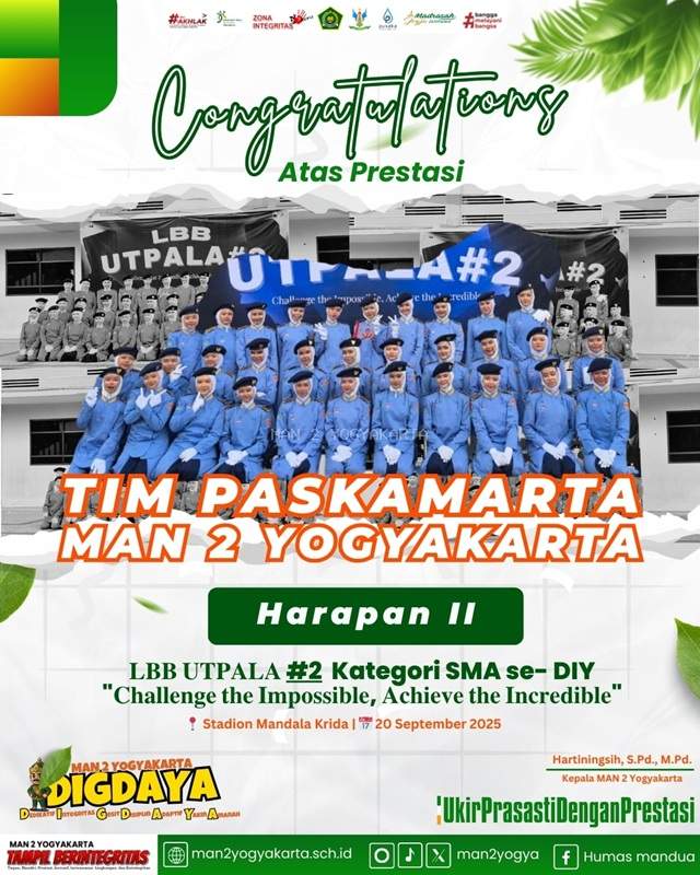 Prestasi ini menambah deretan kebanggaan MAN 2 Yogyakarta, sekaligus mengokohkan semangat siswa untuk terus menantang keterbatasan dan meraih yang luar biasa, sejalan dengan tema lomba tahun ini. (pusp)